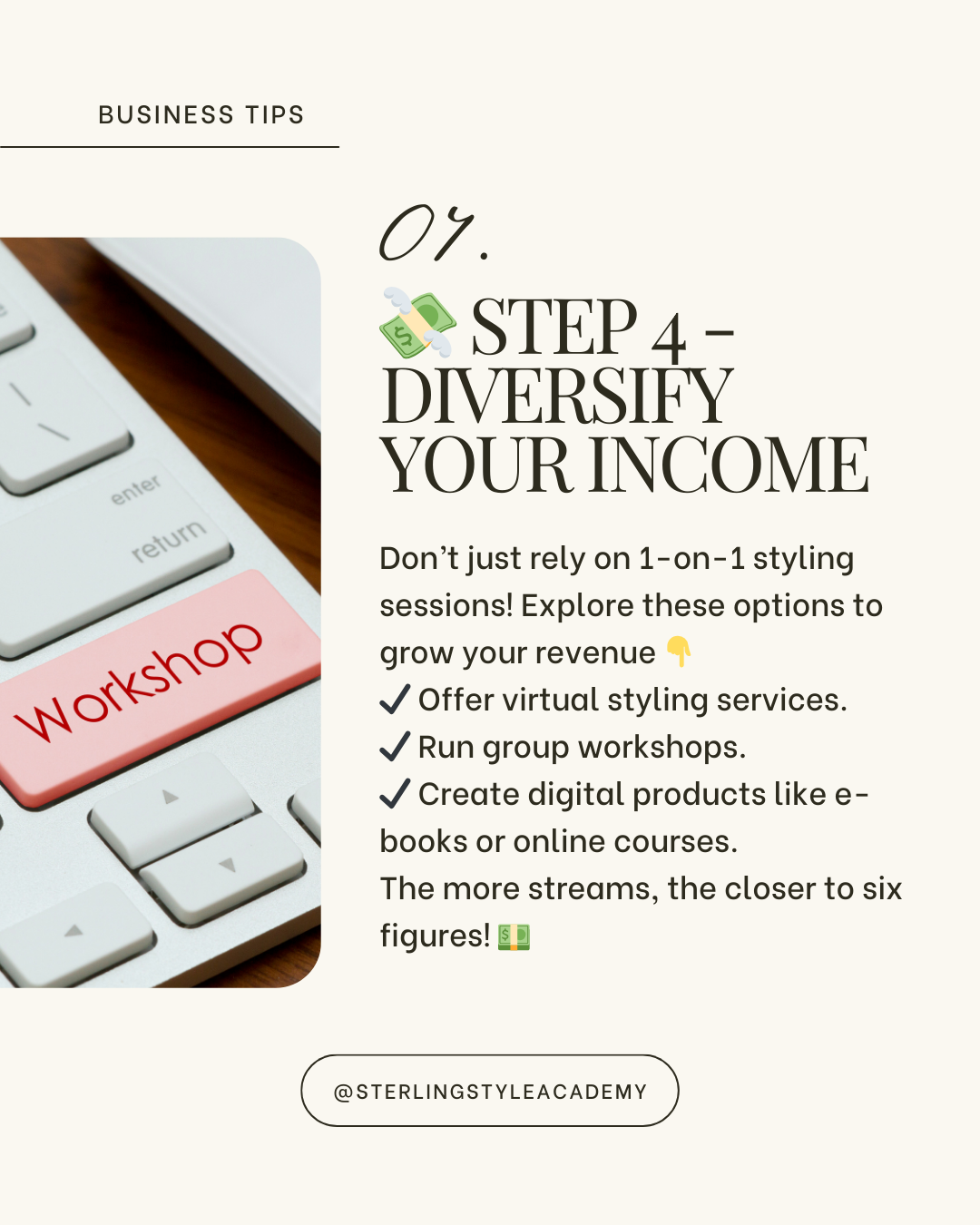 If you're wondering how to develop a 6-figure business as a personal stylist, one of the most important strategies is income diversification. While one-on-one styling sessions may be your primary service, relying on a single income stream limits your earning potential.