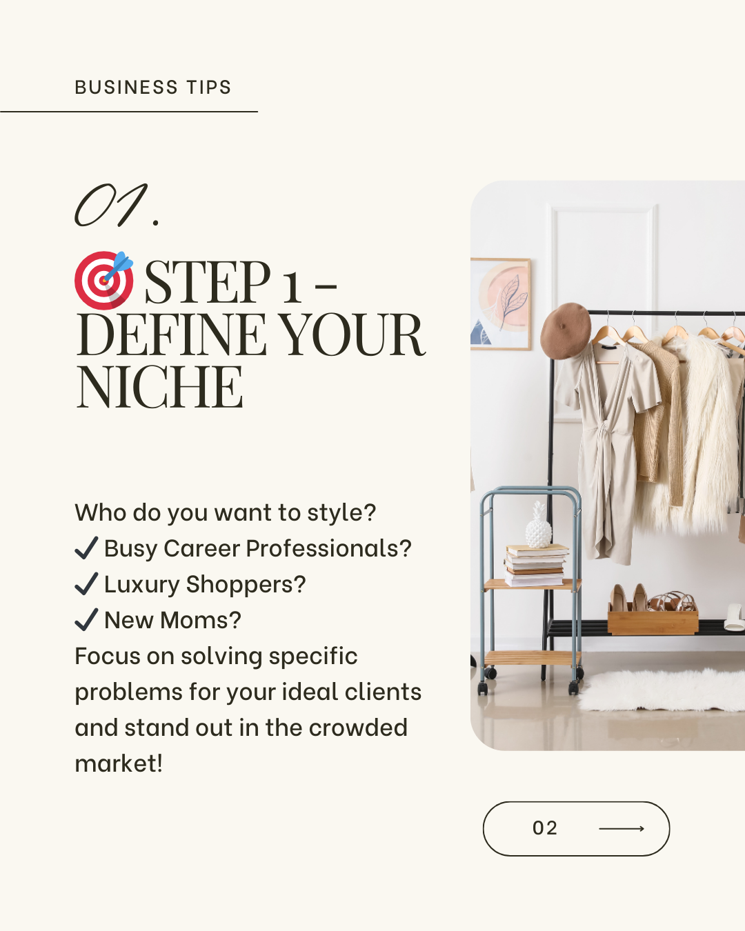 One of the first things you need to do when exploring how to develop a 6-figure business as a personal stylist is to clearly define your niche. The styling world is wide-ranging, from wardrobe makeovers and image consulting to luxury shopping and personal branding. Your niche will help you stand out in a competitive market and attract clients who value your specialized expertise.