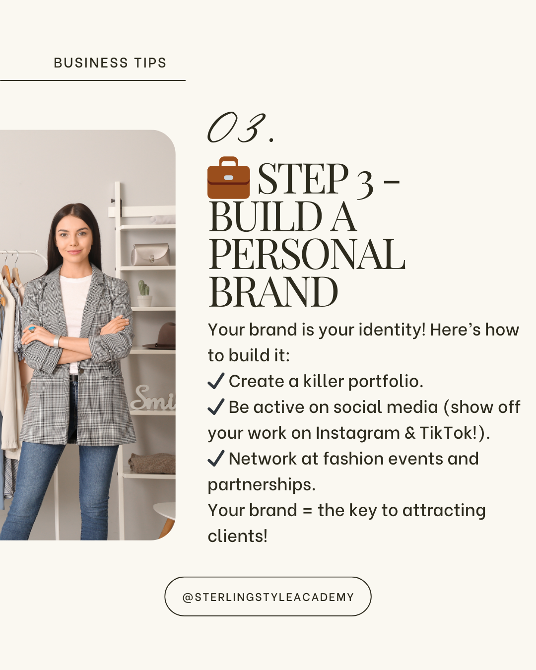 Your messaging should reflect your values, expertise, and the problems you solve for clients. For example, if your focus is working moms who need practical yet stylish wardrobes, show empathy for their busy lives while offering solutions.